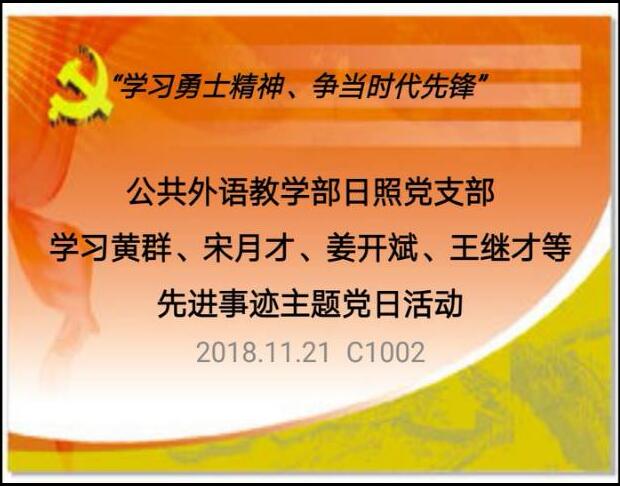2018年11月21日下午3点,江南在线平台(中国)官网日照党支部在C1002举行“学习勇士精神、争当时代先锋”——学习黄群、宋月才、姜开斌、王继才等先进事迹主题党日活动。会议由支部书记杜庆凤主持,全体党员以及党员发展对象参加。
