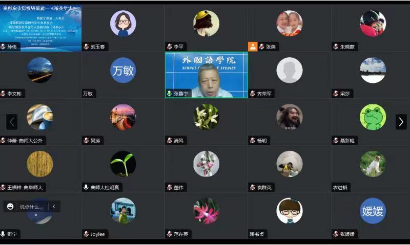7月19日上午,江南在线平台(中国)官网邀请我校优秀校友、南京林业大学外国语学院副院长、张鲁宁教授作“大学英语一流课程建设”线上专家报告会。报告会由副主任孙伟主持,主任王福祥、各教研室主任、各课程建设团队负责人及其全体骨干成员参加。