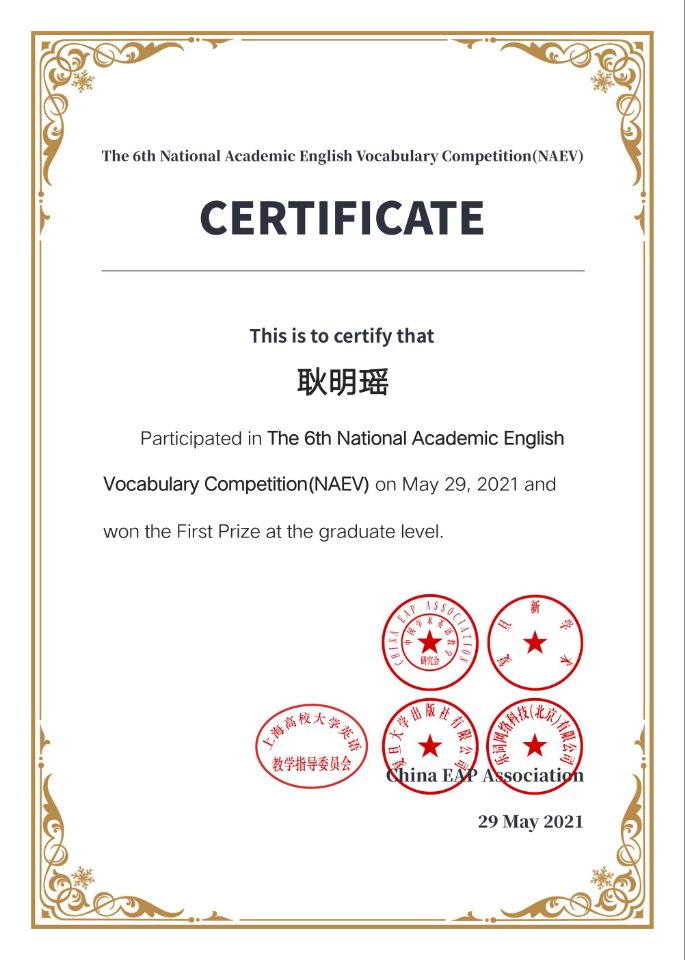近日,由中国学术英语教学研究会、上海高校大学英语教学指导委员会、复旦大学出版社主办,曲师大江南在线平台(中国)官网和曲园学术英语社团承办的“第六届全国大学生学术英语词汇竞赛”圆满结束。继去年我校两名学子获全国一等奖后,本次大赛,十名曲园学子再次获得全国一等奖。