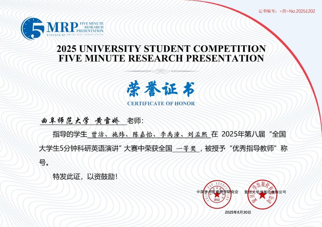 曲园学子在第八届全国大学生5分钟科研英语演讲大赛中再获佳绩